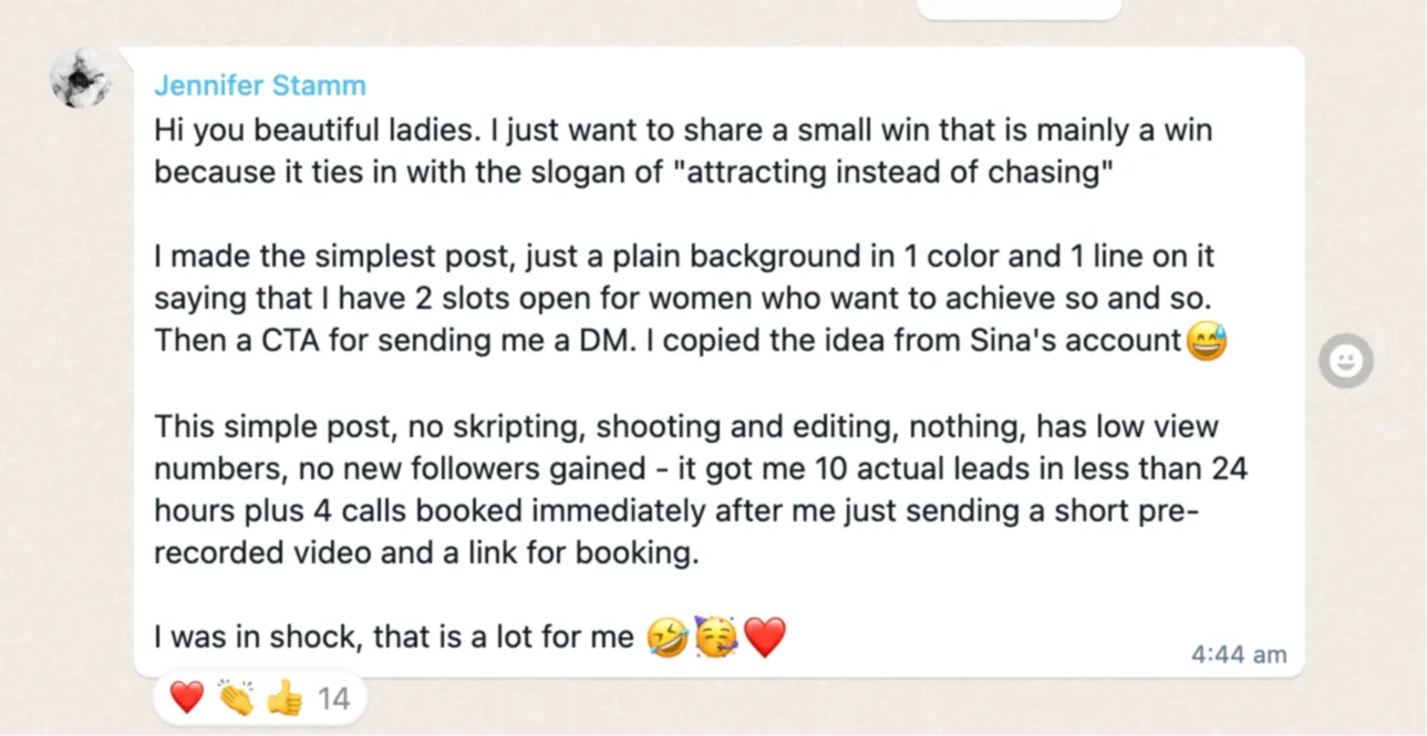 Now with 10 years of experience, I’ve helped 159+ women do the same. They’ve built personal brands, attracted premium clients, and scaled to five-figure weeks. No low-priced products. No exhausting hustle. But a feminine approach to business that actually works.